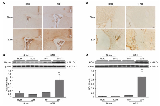 The BBB breakdown in LCR and HCR rats was examined by measuring albumin extravasation in the periventricular region. Immunohistochemistry staining revealed greater albumin extravasation after SAH in LCR rats than in HCR rats (Figure 3A), which was confirmed with a Western blotting analysis (LCR albumin/β-actin ratio 1.04 ± 0.32 vs. 0.29 ± 0.04 in HCR rats; p < 0.01, Figure 3B).
