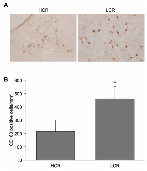 The number of CD163-positive cells after SAH was greater in LCR rats than in HCR rats. (A) Representative images of periventricular CD163 immunohistochemistry 24 h after SAH in HCR and LCR rats. Scale bar = 20 μm. (B) Quantification of the number of CD163-positive cells after SAH. Values are mean ± SD; ** p < 0.01 versus HCR group.