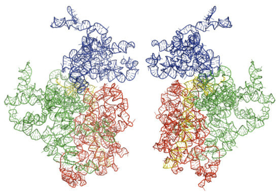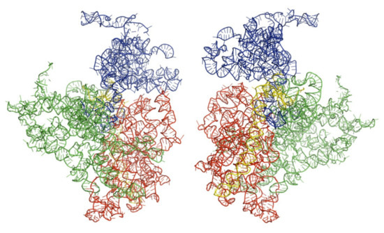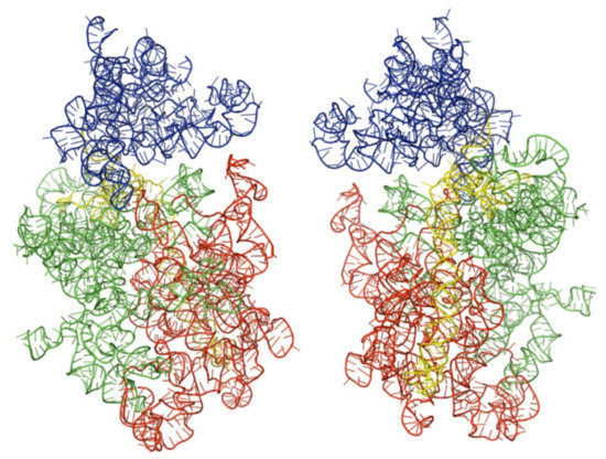 Architectural tertiary structure of Leishmania major 18S rRNA front and back view. Shown is the 18S rRNA, colored differently depending with domains (5′major—red, Central—green, 3′major—blue, and 3′minor—yellow).