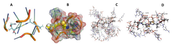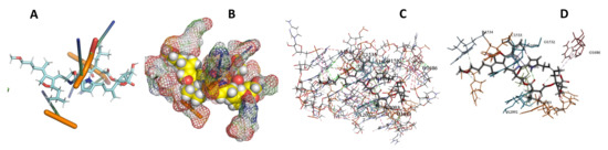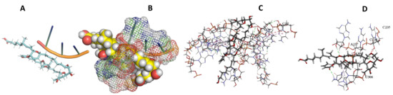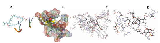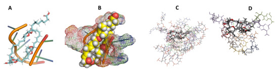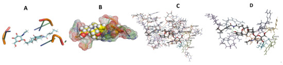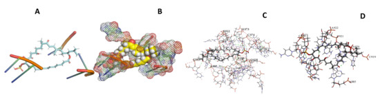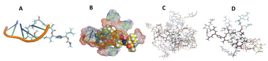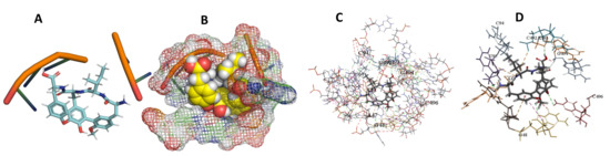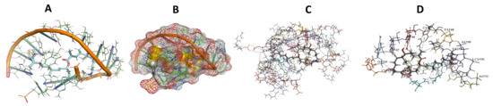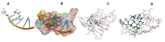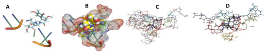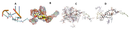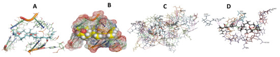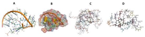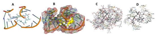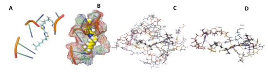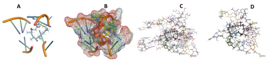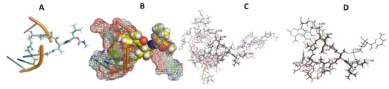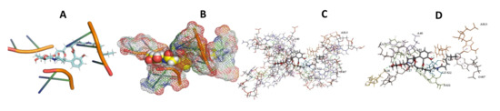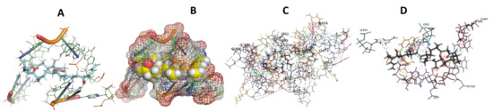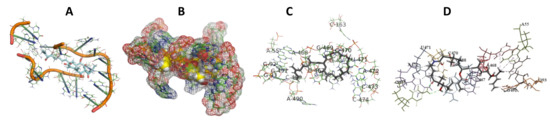 T. cruzi + cittilin. (A): Best binding pose and nucleotides involved. (B): Schematic binding pocket. (C): shows the Nucleotides component that re involved in binding. (D): Shows the main bonds involved between the compound and the nucleotide component.