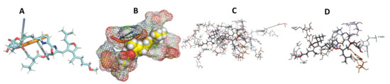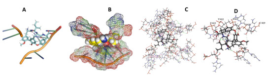 This study used the predicted structures of the 18S rRNA of the selected kinetoplastids Leishmania major (M12676), Trypanosoma brucei (M12676), and Trypanosoma cruzi (AF245382). The docked position of the best 20 compounds for all the kinetoplastids, as is shown below in Figure 4, Figure 5, Figure 6, Figure 7, Figure 8, Figure 9, Figure 10, Figure 11, Figure 12, Figure 13, Figure 14, Figure 15, Figure 16, Figure 17, Figure 18, Figure 19, Figure 20, Figure 21, Figure 22, Figure 23, Figure 24, Figure 25, Figure 26, Figure 27, Figure 28, Figure 29, Figure 30 and Figure 31. A: Best binding pose and nucleotides involved B: Shows schematic the binding pocket C: shows the Nucleotides component that re involved in binding D: Shows the main bonds involved between the compound and the nucleotide component