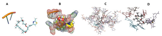 L. Major bound to Angiolam. (A): Best binding pose and nucleotides involved. (B): Schematic binding pocket. (C): shows the Nucleotides component that re involved in binding. (D): Shows the main bonds involved between the compound and the nucleotide component.