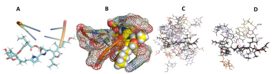 L. major + Sorangicin A. (A): Best binding pose and nucleotides involved. (B): Schematic binding pocket. (C): shows the Nucleotides component that re involved in binding. (D): Shows the main bonds involved between the compound and the nucleotide component.