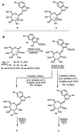 4.2. Synthesis of Indolyl Septanosides 8 and 9