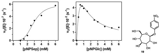 4.6. Kinetics of Streptomyces β-Glucosidase with p-Nitrophenyl Septanoside 19