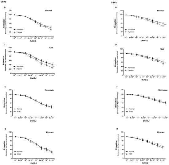 Vasorelaxation in response to NaNO2 was not different between normal and FGR CPAs and CPVs, under either normoxia (Figure 1E,F) or hypoxia (Figure 1G,H). Maximal relaxation to NaNO2 (Vmax) was enhanced in conditions of hypoxia (p < 0.05; Supplementary Table S1), whereas sensitivity to NaNO2 (LogEC50) was not different.