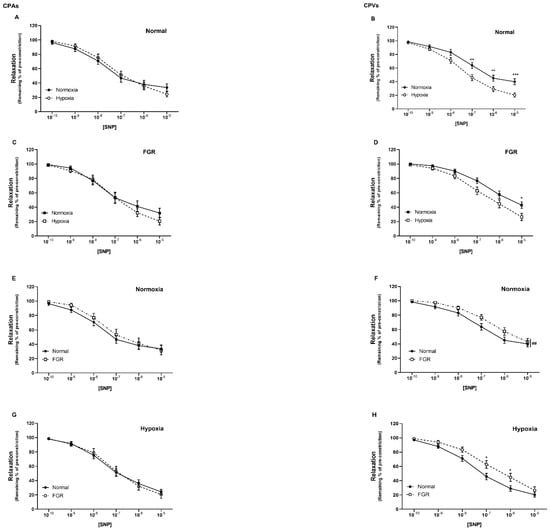 Under conditions of either normoxia or hypoxia, respectively, comparison between normal and FGR vessels showed no difference in CPAs (Figure 2E,G), whereas there was a significant reduction of vasorelaxation in response to SNP in CPVs from FGR pregnancies (p < 0.01, p < 0.0001; Figure 2F,H, respectively).