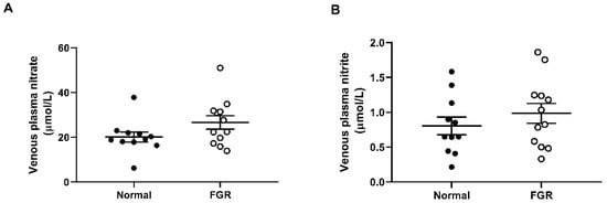 With regards to the plasma levels of nitrate and nitrite in the fetal circulation, we found no significant difference between normal and FGR pregnancies. Other groups have reported reduced concentrations of nitrite/nitrate in the maternal plasma of FGR pregnancies []. Alternatively, higher levels of nitrite have been found in umbilical vein blood samples from FGR pregnancies [], with some studies even correlating increased nitrite levels with the severity of FGR []. The reasons for such between-study discrepancies remain unclear. However, it is worth noting that in these previous studies, reported nitrite concentrations were markedly higher (~30 µmol/L) compared with the values reported in the present study (~1 µmol/L). These previous studies utilized the Griess method to quantify plasma nitrate/nitrite concentrations which, due to its reliance on absorption at 548 nm, may inadvertently measure alternative plasma metabolites that have similar absorption frequencies.