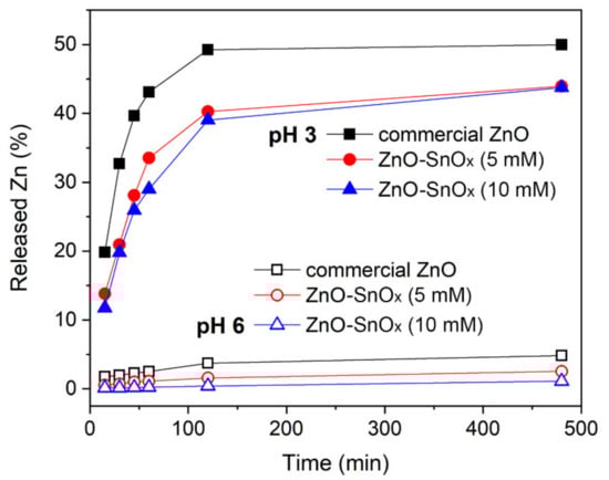 2.2. Enhancement in Chemical Stability of ZnO–SnOx Core–Shell Nanoparticles