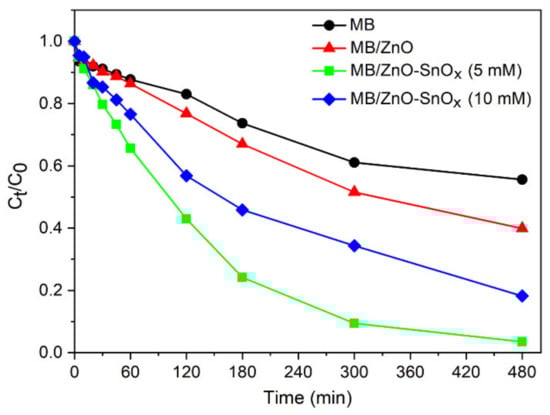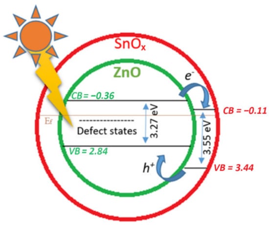 2.5. Photocatalytic Performance of ZnO–SnOx Core–Shell Nanoparticles under Visible Light Irradiation