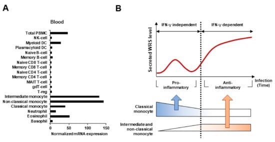 RNA and protein expression data generated by the Human Protein Atlas project indicates that WRS is abundantly expressed in monocytes (http://www.proteinatlas.org/ENSG00000140105-WRS/blood, accessed on 17 December 2020). Monocytes are early responders to pathogens and maintain vascular homeostasis in acute infections []. Like proteins that specifically act on monocytes, WRS is abundantly expressed during differentiation from monocytes to monocyte-derived macrophages (MDMs) or dendritic cells (DCs) [,]. In addition, microbial infection and IFN-γ stimulation causes monocytes, but not B, T, or natural killer (NK) cells, to produce and secrete WRS [,,]. Classical (CD14+CD16−), intermediate (CD14+CD16+), and non-classical (CD14−CD16+) monocytes have been characterized and relative ratios (%) of monocyte subsets have been determined to aid in understanding the pathogenesis of infectious and other inflammatory disorders. WRS is more heavily expressed in intermediate and non-classical monocytes compared to the classical subset (Figure 1A). At the early stages of infection, FL-WRS is secreted from monocytes and directly binds to TLR4-MD2 complexes on macrophages to activate phagocytosis []. Initial FL-WRS secretion is IFN-γ-independent and acts as a warning to prime innate immunity. Similar to these pro-inflammatory functions of FL-WRS, classical monocytes also play a crucial role in phagocytosis during the initial inflammatory response [].