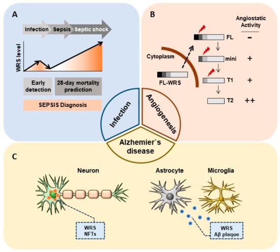 Non-canonical physiopathological roles of WRS. (A) Secreted WRS as a sepsis biomarker. Secreted WRS is a potential biomarker not only for the early detection of sepsis but also for predicting 28-day mortality. (B) Different angiostatic activities of each WRS variant in angiogenesis. Mini-, T1-, and T2-WRS have antiangiogenic effects that may be related to metastasis in tumor microenvironments. (C) Intracellular oligomerized WRS with NFTs and extracellular plaque-like WRS, along with Aβ plaques, are detected in AD.