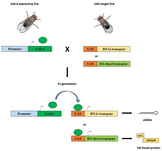 - Phelps, C.B.; Brand, A.H. Ectopic gene expression in Drosophila using GAL4 system. Methods 1998, 14, 367–379. [Google Scholar] [CrossRef] [PubMed]
