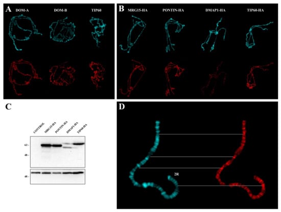 It was previously found that BAP55 and TIP60 subunits tend to be localized to the polytene chromosome interbands [18,24]. We confirmed such localization for TIP60 and found a similar behavior for DOM-A, DOM-B, PONTIN-HA, MRG15-HA, and DMAP1-HA (Figure 2). The polytene chromosome interbands are DAPI-negative regions that are usually associated with open chromatin regions characterized by the presence of RNA polymerase II, chromatin remodeling complexes and proteins that recognize the origins of DNA replication [34,35]. It is possible that occupancy of these regions by the tested subunits could facilitate the action in switching off or on of group of genes during D. melanogaster development or making the intervention in DNA damage response timely and efficiently. It has indeed been found that a reduction of the levels of the TIP60 protein in D. melanogaster caused up or down regulation of group of genes, implying a role in both gene activation and repression [18].