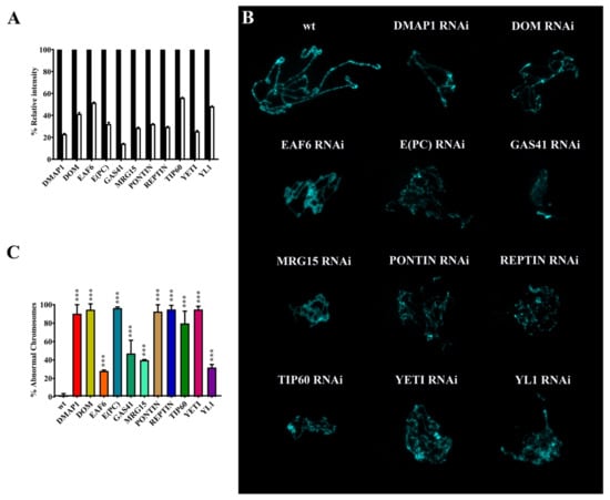 As shown in Figure 3B,C and Table 3, the silencing of the genes coding for the subunits under investigation led to significant alterations of higher-order organization of polytene chromosomes. Chromosomes appeared smaller and with a thin and disorganized structure.