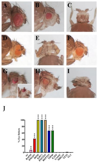 Eye morphology and differentiation defects after silencing of genes coding for dTip60 complex subunits. (A) Wild-type control; (B,C) silencing of DMAP1 coding gene caused eye reduction and microcephaly, respectively; (D,E) simultaneous silencing of DOM-A and DOM-B caused eye reduction and formation of extra-growths; (F) eye reduction after E(PC) silencing; (G) PONTIN silencing caused eye reduction and formation of extra-growth; (H) strong eye reduction; and (I) microcephaly after REPTIN silencing; (J) quantification of eye defects. p value <0.005 (**) or p value <0.0005 (***), compared with the control group.