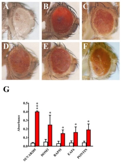 Dominant suppression of In(1)wm4 variegation by mutations in Bap55, Eaf6, and Pontin genes. (A) Standard In(1)wm4 variegated phenotype (control); (B) Dominant suppression of In(1)wm4 variegation by Su(var2)05 and (C) Dom3 mutants (positive controls). Dominant suppression of In(1)wm4 variegation by (D) Bap55EY1596, (E) Eaf6d06605, and (F) Pontin5.1 mutant alleles. (G) Quantification of PEV suppression in terms of O.D. Red histograms = eye pigment in presence of the tested mutations; white histograms = controls. p value <0.05 (*) or p value <0.0005 (***), compared with the control group.