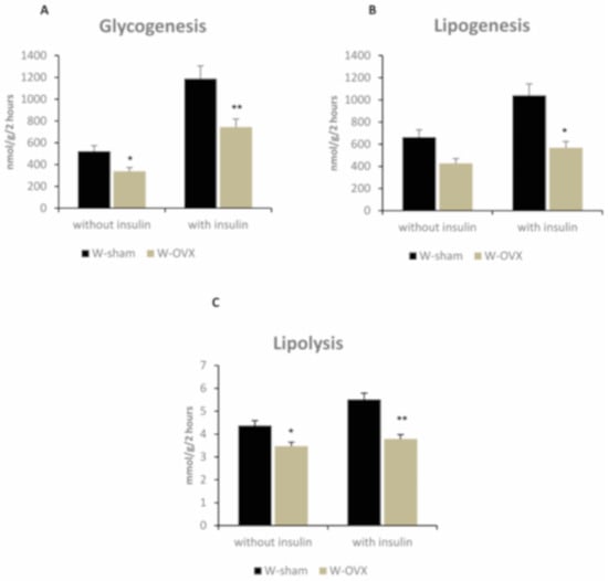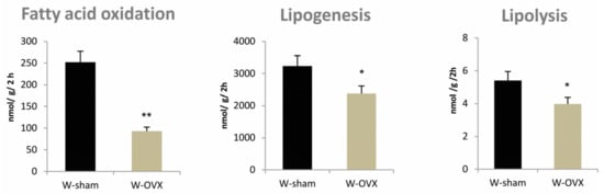 - Nigro, M.; Santos, A.T.; Barthem, C.S.; Louzada, R.A.; Fortunato, R.S.; Ketzer, L.A.; Carvalho, D.P.; de Meis, L. A change in liver metabolism but not in brown adipose tissue thermogenesis is an early event in ovariectomy-induced obesity in rats. Endocrinology 2014, 155, 2881–2891. [Google Scholar] [CrossRef]