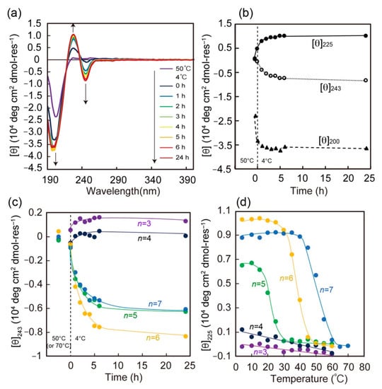 Initially, to assess the effect of peptide chain length on both secondary structure and thermal stability, circular dichroism (CD) studies of 2Np-CMPn (n = 3–7) were performed in water (Figure 2, Figures S2 and S3). Figure 2 shows the time dependence of the CD spectra for 2Np-CMP6 in water (5% TFE) at 4 °C. At 50 °C, the spectrum initially shows a random coil pattern with a negative maximum at approximately 200 nm. When the sample solution was cooled to 4 °C, the conformation changed to a triple helix, as evident from the presence of a maximum at 225 nm and a minimum at 200 nm [37]. Meanwhile, an induced CD effect was clearly observed at 243 nm (negative) and 225 nm (positive) based on a twisted arrangement of 2Np moiety (λmax = 235 nm), reflecting the spiral structure of the triple helix [39]. In our previous study [34], a similar induced CD effect was also observed for an azobenzene-terminated CMP system by triple helix formation when the azobenzene group was directly attached to the CMP chain end without a spacer. Figure 2b shows plots of molar ellipticity at 200 nm ([θ]200), 225 nm ([θ]225), and 243 nm ([θ]243) as a function of time. As time elapses, the [θ]200 value decreases rapidly and reaches a constant value within 2 h, whereas induced CD signals ([θ]243 and [θ]225) continue to change over 6 h. This time lag suggests that the triple helix foldamer behaves as a precursor to further supramolecular assembly triggered by specific interactions of N-terminal 2Np groups and/or C-terminal amide groups (morphological study; described later). Notably, the conformational properties of 2Np-CMPn are chain-length-dependent; 2Np-CMPn with shorter lengths of n=3 or 4 cannot form a triple helix assembly even after incubation for 24 h at 4 °C (Figure 2c and Figure S2). To elucidate the triple helix stability of 2Np-CMPn, their melting temperatures (Tm) were evaluated by monitoring the change in [θ]225 values as a function of temperature (Figure 2d). The cooperative melting curves were obtained only in the case of longer 2Np-CMPn (n = 5–7), and the Tm values gradually decreased by approximately 10–15 °C upon decreasing the repeat number (n) of the GPO triplet from n = 7 to 5.