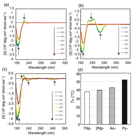 CD spectral changes of 1-Np-CMP6 (a), An-CMP6 (b) and Py-CMP6 (c) in water (5% TFE) upon heating. [CMPs] = 60 μM. (d) Comparison of Tm for various aromatic group-terminated CMPs (n = 6) evaluated from CD analyses.