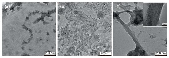 TEM images of 1Np-CMP6 (a), An-CMP6 (b) and Py-CMP6 (c) assemblies formed in water (5% TFE) at 4 °C. [CMPs] = 60 μM. The images were obtained by staining with 1% phosphotungstic acid.