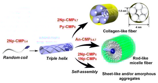 In this study, we prepared short CMPs bearing various aromatic groups: 2-naphthyl (2Np), 1-naphthyl (1Np), 2-anthracenyl (An), and 1-pyrenyl (Py), which are capable of self-assembly into versatile nanofibers. Detailed analyses of the conformation and self-assembly behavior of the CMPs were conducted in water. Specifically, we investigated the effects of the structure and configuration of the terminal aromatic groups, peptide chain lengths, and external changes in temperature on the physicochemical behavior of the CMPs. Terminal modification of CMP with hydrophobic aromatic groups serves as a template for triple helix formation and a trigger to control nanoscale fibrous assembly, and is also useful for fabricating a wide variety of functional nanofibers. In fact, Py-terminated CMP nanofibers demonstrated the ability to encapsulate small hydrophobic molecules and acted as a thermo-responsive wavelength-conversion material.