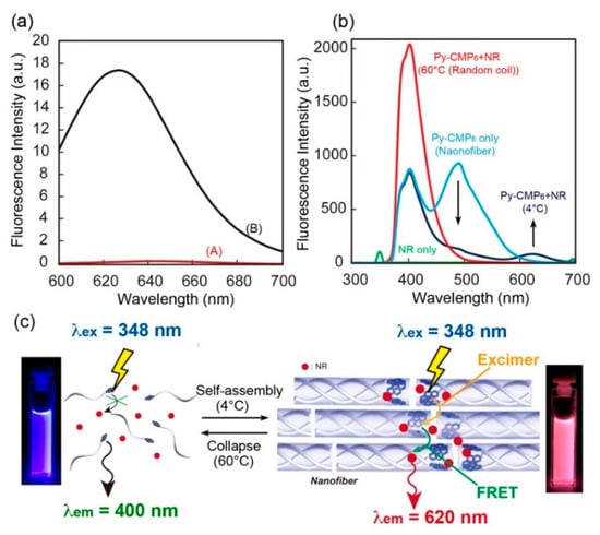 Finally, we investigated the fluorescence properties of the Py-CMP6/NR mixed molecular system based on its unique self-assembled structure. As described above, Py-CMP6 assembles into collagen-like nanofiber bundles in aqueous media at 4 °C. During self-assembly, emission switching occurs from the monomer (λem = 402 nm) to excimer (λem = 490 nm) due to π-stacking of Py groups (λex = 348 nm) (Figure S6). Figure 7b shows the fluorescence emission spectra of Py-CMP6/NR at 4 °C (nanofiber form) and 60 °C (random coil form) when excited at 348 nm. Fluorescence emission from NR is clearly observed at 620 nm in the Py-CMP6/NR nanofiber system (4 °C), demonstrating that the electron energy of the Py group excited at 348 nm is transferred to NR via Py excimer formation (Figure 7c). As a control, we confirmed that no fluorescence at 620 nm is observed in solutions with only NR or Py-CMP6 nanofibers when excited at 348 nm. More importantly, such conversion of energy from shorter to longer wavelengths can be achieved only in the triple-helix-based nanofiber state and exhibits completely different behavior at 60 °C; that is, it disappears with the collapse of the nanofibers, resulting in a color change. This feature would be useful in designing novel thermo-responsive optical nanomaterials and artificial extracellular matrix (ECM) materials with damage detecting ability.
