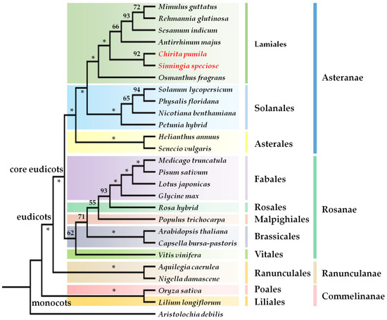 The strict consensus tree showing relative positions of major model systems. The tree is generated from datasets of combined rbcl, matk and ndhf data. Bootstrap values are labeled above the branches. The asterisk indicates 100% support. The species in red font indicate two representatives of Gesneriaceae.
