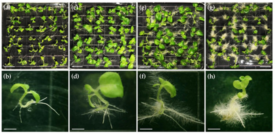 Effects of NAA on seedling growth. (a,b) Seedlings grown on medium without external phytohormone. (c,d) Seedlings grown on medium supplemented with 0.02 mg/L NAA. (e,f) Seedlings grown on medium supplemented with 0.05 mg/L NAA. (g,h) Seedlings grown on medium supplemented with 0.1 mg/L NAA. Scale bars: 1 cm in panels (a,c,e,g); 0.2 cm in panels (b,d,f,h).