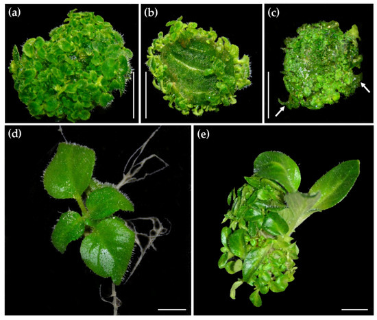 Effect of placing orientation of leaf explants on shoot regeneration. (a) The adaxial side of leaf explants was placed upward. (b) The abaxial side of leaf explants was placed upward. (c) The adaxial view of explants cultured with abaxial surface upward. (d) A seedling grown on the medium without 6-BA and NAA. (e) A seedling grown on the medium containing 0.5 mg/L 6-BA and 0.1 mg/L NAA. Scale bars: 0.5 cm.
