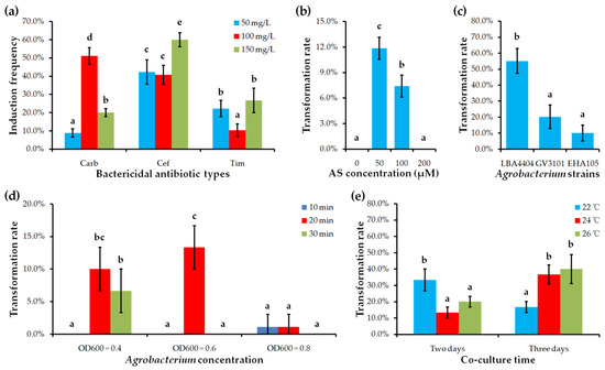 Effect of different factors on transformation rate or shoot induction frequency. (a) Bactericidal antibiotic types and their concentrations. (b) Acetosyringone (AS) concentration. (c) Agrobacterium strains. (d) Agrobacterium concentration and incubation time. (e) Co-culture time and temperature. Values shown (mean ± standard deviation) are the average of three replicates with each replicate containing 30–45 explants. The difference significance was tested using the LSD test (p < 0.05) of SPSS 16.0 software (SPSS Inc.). Columns labeled with different letters mean significantly different.