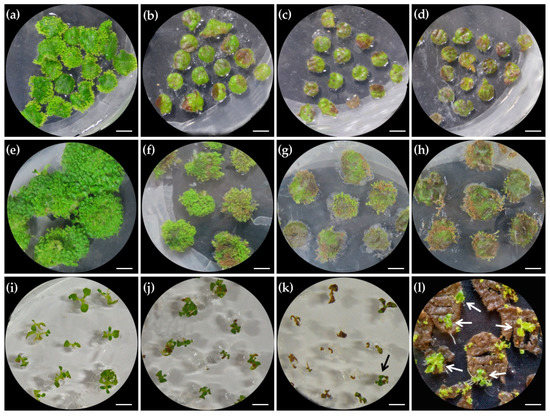 Optimization of hygromycin (Hyg) concentration for selecting positive transgenic lines at different stages. (a–d) The effect of Hyg concentration on bud induction: (a) 0 mg/L Hyg; (b) 10 mg/L Hyg; (c) 15 mg/L Hyg; (d) 20 mg/L Hyg. (e–h) The effect of Hyg concentration on adventitious bud growth. (e) 0 mg/L Hyg; (f) 5 mg/L Hyg; (g) 10 mg/L Hyg; (h) 15 mg/L Hyg. (i–l) The effect of Hyg concentration on adventitious bud elongation. (i) 0 mg/L Hyg; (j) 5 mg/L Hyg; (k) 10 mg/L Hyg; (l) The growth of negative and positive (marked by arrows) transgenic shoots, showing the rhizogenesis of positive shoots and their normal elongation on explants. Scale bars: 0.5 cm.