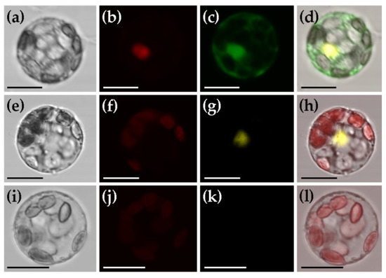 To rapidly determine the basic features of a new protein of interest, such as subcellular localization and potential protein–protein interactions, it is of great convenience to test these in a transient gene expression system before stable transformation. For this purpose, we checked if these can be realized in mesophyll protoplasts of C. pumila. Excitingly, we detected the subcellular protein localization of GFP in both nucleus and cytoplasm, while H2B-mCherry in nucleus exclusively (Figure 6a–d). To check the availability of C. pumila transient gene expression system in detecting protein–protein interactions by bimolecular fluorescence complementation assay, we co-transformed a pair of interacted proteins TDR1 and bHLH142 [46] fused to YFPN and YFPC, respectively (plasmids TDR1-YFPN and bHLH142-YFPC). As expected, we observed obvious YFP fluorescence in the nucleus of protoplasts co-transformed with TDR1-YFPN and bHLH142-YFPC (Figure 6e–h), while no fluorescence in the cells transformed with TDR1- YFPN and YFPC (Figure 6i–l). These results indicate that the transient gene expression system of C. pumila mesophyll protoplasts is competent, at least, in analyzing the subcellular protein localization and potential protein–protein interactions.