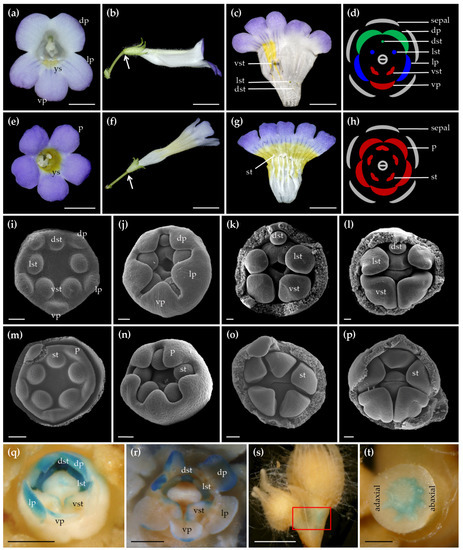 - Luo, D.; Carpenter, R.; Vincent, C.; Copsey, L.; Coen, E. Origin of floral asymmetry in Antirrhinum. Nature 1996, 383, 794–799. [Google Scholar] [CrossRef]