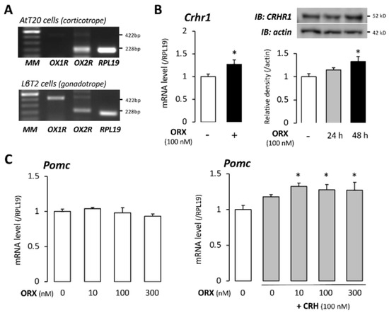 Expression of orexin receptors and the effect of orexin A on CRH receptor and POMC expression in AtT20 cells. (A) The expression of mRNAs encoding OX1R, OX2R, and RPL19 was examined by RT−PCR in AtT20 cells compared with that in mouse gonadotrope LβT2 cells. MM: molecular weight marker. (B) After preculture, cells were treated with orexin (ORX) in serum-free media. After 24−h culture, total cellular RNA was extracted, and after 24−h or 48−h culture, cell lysates were extracted. The mRNA expression levels of Crhr1 were quantified by qPCR, and the expression levels of target genes were standardized by the RPL19 level in each sample. The cell lysates were analyzed by immunoblotting (IB) with anti−CRHR1 and anti-actin. (C) After preculture, cells were treated with ORX alone or with the combination of ORX and CRH in serum-free media. After 24−h culture, total cellular RNA was extracted, and the mRNA expression levels of POMC were quantified by qPCR. The expression levels of target genes were standardized by the RPL19 level in each sample. Results are shown as means ± SEM of data from at least three independent experiments. Statistical analysis was performed by the unpaired t−test (B) or ANOVA (B,C). * p < 0.05 vs. between the control groups.