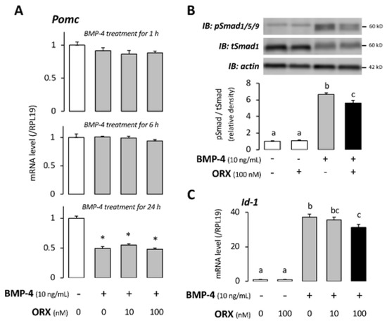 Next, we examined the effect of orexin on the action of BMP-4 in AtT-20 cells. We previously reported that BMP-4 suppressed POMC mRNA expression in AtT20 cells [20]. As shown in Figure 2A, BMP-4 (10 ng/mL) treatment for 24 h decreased POMC mRNA, consistent with the results of our previous study. Co-treatment with orexin (10–100 nM) did not change the POMC mRNA expression induced by BMP-4 treatment from 1 h to 24 h (Figure 2A). On the other hand, focusing on the effect of orexin on BMP-Smad signaling, stimulation with BMP-4 (10 ng/mL) for 1 h activated Smad1/5/9 phosphorylation in AtT20 cells (Figure 2B). Importantly, orexin A (100 nM) pretreatment for 24 h inhibited the phosphorylation of Smad1/5/9 by BMP-4 (Figure 2B). We next examined the effect of orexin A on the transcription of Id-1, a target gene for BMP-receptor signaling. As shown in Figure 2C, BMP-4 (10 ng/mL) treatment for 1 h significantly upregulated Id-1 mRNA, and co-treatment with orexin A (100 nM) suppressed the expression of Id-1 mRNA induced by BMP-4.