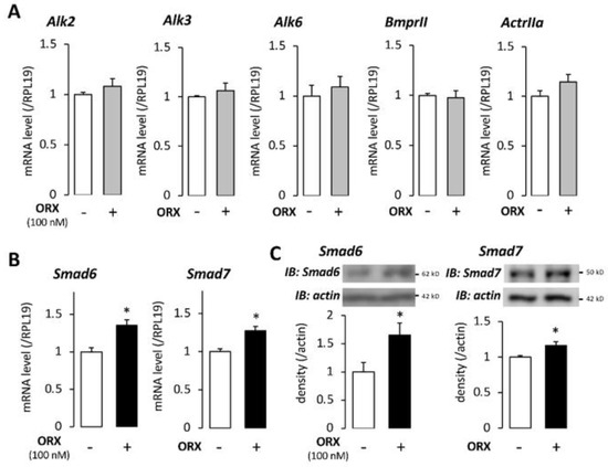 Effects of orexin A on the expression of BMP-receptor signaling molecules in AtT20 cells. (A,B) AtT20 cells treated with orexin (ORX) for 24 h were extracted, and the mRNA expression levels of Alk2, Alk3, Alk6, BmprII, ActrIIa (A), Smad6, and Smad7 (B) were quantified by qPCR. The expression levels of target genes were standardized by the RPL19 level in each sample. (C) Cells were treated with ORX in serum−free media for 24 h. The cell lysates were subjected to immunoblot (IB) analysis using antibodies that detect Smad6, Smad7, and actin. Results are shown as means ±SEM of data from at least three independent experiments. Statistical analysis was performed by the unpaired t-test. * p < 0.05 vs. between the control groups.