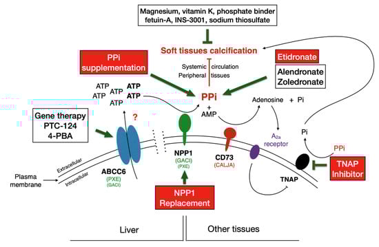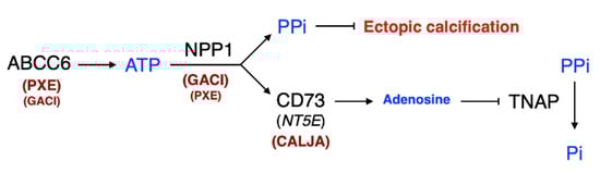 Ectopic calcification can lead to clinical symptoms when it occurs in cardiovascular tissues and has been the object of intense research focus. Many host, environmental, and genetic factors contributing to this calcification have been identified [], but there are still gaps in our understanding []. In recent years, the identification of mutations in the ATP-binding cassette (ABC) transporter ABCC6 [,,] and the characterization of its function [] has provided new molecular insight into the regulation of ectopic calcification inhibition in relation to pyrophosphate (PPi). ABCC6 mediates the cellular efflux of nucleotides, notably ATP, which is rapidly converted into PPi and adenosine at the cellular surface by the ectonucleotidases NPP1 (encoded by ENPP1) and CD73 (encoded by NT5E) [,,,]. Both PPi and indirectly adenosine are major inhibitors of calcification. ABCC6 deficiencies underlie the calcification disorders PXE (MIM#264800) and a cardiac calcification phenotype (DCC) described in mice [,,]. GACI (MIM#208000) is primarily linked to NPP1, the key enzyme that generates PPi []. However, some cases of GACI (MIM#614473) are caused by ABCC6 mutations, while some PXE patients carry disease-causing variants only in ENPP1 [,]. CALJA (MIM#211800) is due to mutations in CD73 (NT5E) []. PXE, together with GACI and CALJA form a spectrum of diseases with overlapping calcification processes but with distinct clinical features. If PXE, GACI, and DCC result from a deficit in PPi production [,], CALJA is caused by increased PPi degradation [,] (Figure 1). The explanation of these phenotypes places ABCC6 as an upstream modulator of an extracellular purinergic pathway that, among other things, inhibits mineralization by regulating the Pi/PPi ratio in connective tissues (Figure 1). Although it has been recently claimed that ABCC6 acts downstream of NPP1 [], this hypothesis is highly controversial in the field [] and contradicts most studies [,,,]. This pathway (Figure 1) and the molecular cascade leading to PPi generation and TNAP inhibition offers many opportunities for therapeutic interventions in the case of PXE and also GACI.