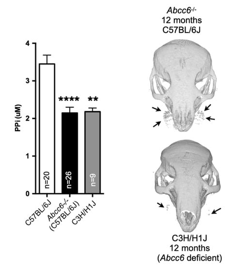 - Zhao, J.; Kingman, J.; Sundberg, J.P.; Uitto, J.; Li, Q. Plasma PPi Deficiency Is the Major, but Not the Exclusive, Cause of Ectopic Mineralization in an Abcc6 Mouse Model of PXE. J. Investig. Dermatol. 2017, 137, 2336–2343. [Google Scholar] [CrossRef]