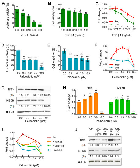 Testing of TGF-β1 and palbociclib in Huh7-luc/neo cell culture. (A/D) Luciferase activity (n = 3/4, respectively) and (B/E) cell viability (n = 3/6, respectively) were measured as described in Materials and Methods. (C/F) To assess the intracellular balance of luciferase (Luc) and viral replicon (Rep), the curves of normalized luciferase activity (La/Cv) and replicon content (HCV RNA/mRNA Actin) obtained by qRT-PCR (n = 3) were plotted. (G) Representative immunoblot and (H) graphical presentation of results of WB analysis of NS3 and NS5B content expressed as the relative intensity (RI) of either the NS3 or NS5B band versus the α-tubulin band (n = 3). (I) Dose–response curves for Luc, NS3, and NS5B normalized to values of replicon and proteasome activity (reference values of Luc and Rep correspond to data from Figure 1F, whereas the values of NS3 and NS5B correspond to data from Figure 1H). (J) Immunoblot analysis of NS3 and NS5B degradation pathways after treatment of cells for 18 h with cycloheximide (CHX), a translation inhibitor, MG132 (MG), a proteasomal activity inhibitor, and hydroxychloroquine (CHQ), a lysosomal acidic pH-neutralizing agent. In all cases, with the exception of Figure 1J, cells were treated with indicated concentrations of TGF-β1 and palbociclib for 48 h and 72 h, respectively; n is the number of independent experiments. Statistical significance (assessed by the t-test): *** (p < 0.001), ** (0.001 < p < 0.01), * (0.01 < p < 0.05), # (0.05 < p < 0.1), ns—not significant.