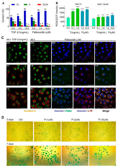 TGF-β1 and palbociclib launch the senescence program in Huh7-luc/neo cells. (A) Cells were treated with indicated concentrations of TGF-β1 and palbociclib for 48 h and 24 h, respectively, and analyzed for cell cycle distribution by flow cytometry. (B) 24 h of incubation with TGF-β1 and palbociclib induced oxidative stress that was manifested in ROS production detected by fluorometry of cells stained with DCF-DA (n = 5). (C) Confocal microscope images of Acridine Orange-stained cells treated with indicated concentrations of TGF-β1 and palbociclib (shown in the upper left corner) and colocalization of intrinsic fluorescence of LTR and palbociclib. (D) Light microscope images (×10 magnification) of X-Gal-stained cells treated with palbociclib for 3 and 7 days. Blue-green indicates positive staining for β-galactosidase activity; n is the number of independent experiments. Statistical significance (assessed by the t-test): *** (p < 0.001), ** (0.001 < p < 0.01).