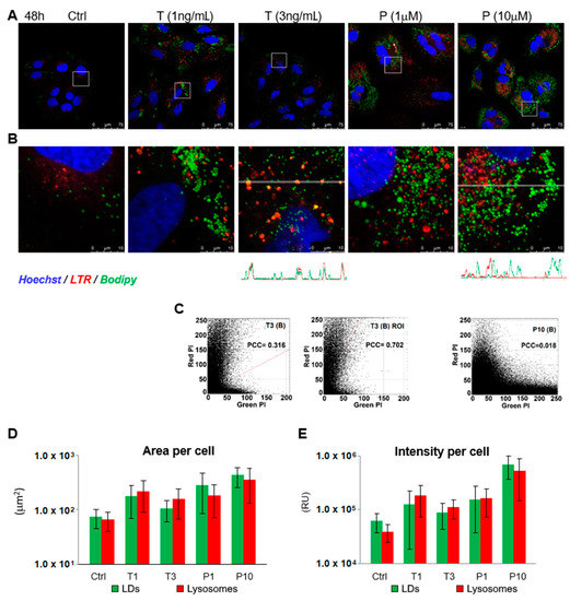 TGF-β1 and palbociclib cause accumulation of lipid droplets in hepatoma cells. (A,B) Confocal microscope images of Hoechst-, LTR-, and Bodipy-stained Huh7-luc/neo cells treated with indicated concentrations of TGF-β1 (T) and palbociclib (P) for 48 h and colocalization of Bodipy (LDs) and LTR (lysosomes) fluorescence signal indicated by red-green-blue (RGB) band profiles shown below the corresponding image. (C) Scatterplots of green and red pixel intensities (PI) of the cells shown in T3 (B) and P10 (B) and scatterplot in the region of interest (ROI) containing lysosomes in cells shown in T3 (B); PCC—Pearson’s correlation coefficient. (D) Area (µm2 per cell) occupied by green label (LDs) and red label (lysosomes) in cells shown in Figure 3A and (E) intensity of green (LDs) and red (lysosomes) fluorochromes; emission per cell was calculated as the sum of intensities (0–255) of all green and red pixels in a cell and expressed as relative units (RU). The area of 1 pixel is 0.0574 µm2.
