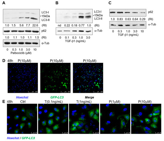TGF-β1 and palbociclib activate biogenesis of autophagosome in hepatoma cells. (A) Western blots for LC3-I, LC3-II, and p62 in Huh7-luc/neo cells treated with palbociclib for 72 h and (B,C)with TGF-β1 for 48 h; α-tubulin was used as a loading control. Protein content is expressed as the relative intensity of either the LC3-II or p62 band versus the α-tubulin band. (D) Assessment of percentage of Huh7 cells stably expressing GFP-LC3 after 48 h of treatment of cells with 10 μM palbociclib (P). (E) Confocal microscope images of Huh7 cells stably expressing GFP-LC3 and treated with indicated concentrations of TGF-β1 (T) and palbociclib (P) for 48 h.