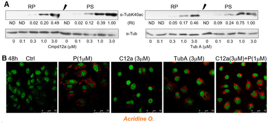 Inhibition of HDAC6 and HDAC6/10 by Cmpd12a and tubastatin A in Huh7-luc/neo cells. (A) Inhibition of HDAC6 deacetylation activity by Cmpd12a and tubastatin A in regularly proliferating (RP) and pre-senescent (PS) Huh7-luc/neo cells treated with indicated concentrations of inhibitors for 24 h, assessed by WB analysis of relative intensity (RI) of the α-tubulinK40ac band versus the α-tubulin band (ND—not defined). (B) Confocal microscope images of Acridine Orange-stained cells treated with indicated concentrations of Cmpd12a (C12a), tubastatin A (Tub A), and palbociclib (P) for 48 h.