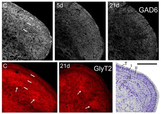 - Lorenzo, L.E.; Magnussen, C.; Bailey, A.L.; Louis, M.S.; De Koninck, Y.; Ribeiro-Da-Silva, A. Spatial and Temporal Pattern of Changes in the Number of GAD65-Immunoreactive Inhibitory Terminals in the Rat Superficial Dorsal Horn following Peripheral Nerve Injury. Mol. Pain 2014, 10, 57. [Google Scholar] [CrossRef]