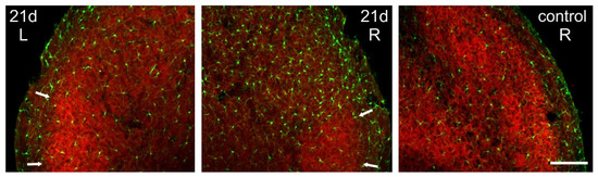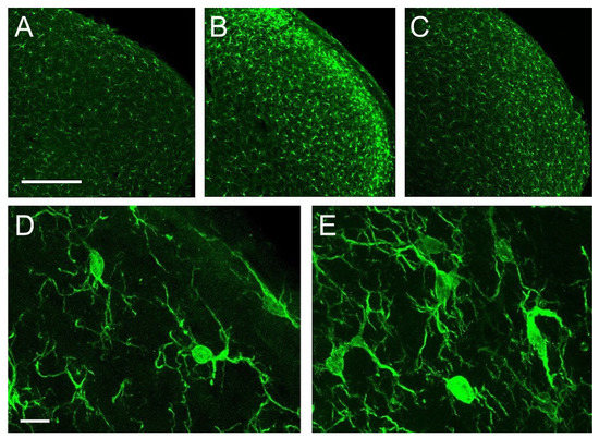 - Eriksson, N.P.; Persson, J.K.E.; Svensson, M.; Arvidsson, J.; Molander, C.; Aldskogius, H. A quantitative analysis of the microglial cell reaction in central primary sensory projection territories following peripheral nerve injury in the adult rat. Exp. Brain Res. 1993, 96, 19–27. [Google Scholar] [CrossRef]