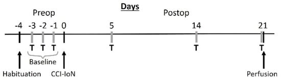 - Krzyzanowska, A.; Pittolo, S.; Cabrerizo, M.; Sánchez-López, J.; Krishnasamy, S.; Venero, C.; Avendaño, C. Assessing nociceptive sensitivity in mouse models of inflammatory and neuropathic trigeminal pain. J. Neurosci. Methods 2011, 201, 46–54. [Google Scholar] [CrossRef] [PubMed]