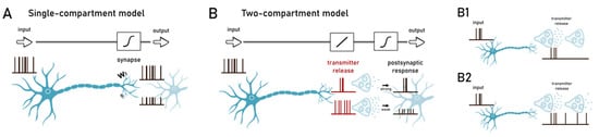 Synaptic modeling: (A) Single compartment synapse acting as a linear multiplier of incoming input. Despite its simplicity, this model lies at the basis of a wide range of computational models of circuit function. (B) Two-compartment models. Presynaptic terminal is believed to behave as a frequency filter able to perform complex forms of temporal filtering discriminating firing patterns while the postsynaptic element controls the gain to modulate neuronal response. (B1) Another level of complexity in modeling synaptic transmission is related to neurotransmitter diffusion. Here synchronous release of neurotransmitters is represented; (B2) asynchronous release of neurotransmitters.