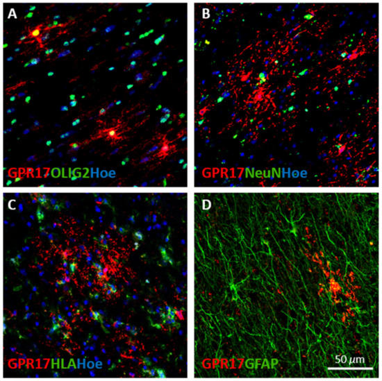 Identification of GPR17+ cells in human brain white matter. The confocal micrographs show the co-localization of GPR17 (in red) with the specific lineage markers for (A) oligodendrocytes (Olig2), (B) neurons (NeuN), (C) inflammatory cells (HLA), and (D) astrocytes (GFAP), in green. Cell nuclei were labelled with Hoechst 33258 (Hoe), in blue. Scale bar 50 µm.