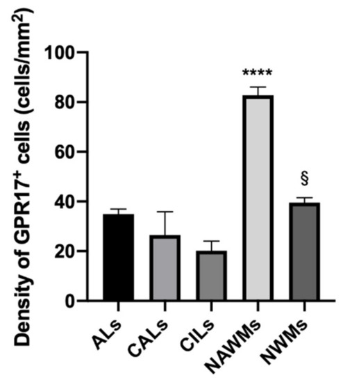Quantification of GPR17+ cells density in white matters of brain tissues in MS patients and healthy controls. The density of GPR17+ cells was calculated as number of marked cells per mm2 of analyzed area. The GPR17+ cells populate all the conditions, as the follows (mean ± SD). ALs = 34.99 ± 3.98; CALs = 26.51 ± 13.2; CILs = 20.2 ± 7.66; NAWMs = 82.67 ± 6.73; NWMs = 39.55 ± 3.43. According to a comparative analysis, a higher prevalence of GPR17+ cells was demonstrated in NAWMs than in all the other conditions, (**** p-value ≤ 0.0001). Furthermore, GPR17 was more represented in NWMs than CILs (§ p-value= 0.02). ANOVA one-way test. ALs: active lesions; CALs: chronic active lesions; CILs: chronic inactive lesions; NAWMs: normal appearing white matter in patients with multiple sclerosis; NWMs: normal white matter in healthy controls.